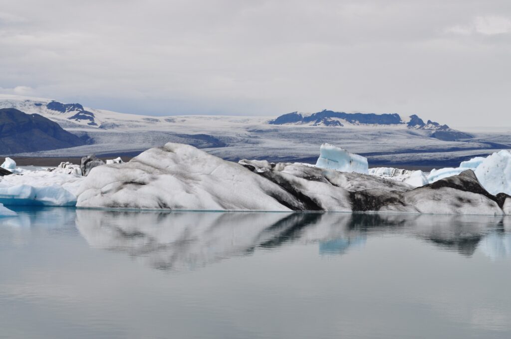 Gli iceberg galleggiano come cattedrali effimere, scolpiti dalla pressione del tempo. Alcuni brillano di un blu intenso, altri si tingono di nero per le ceneri vulcaniche che conservano al loro interno, memoria viva delle eruzioni islandesi.