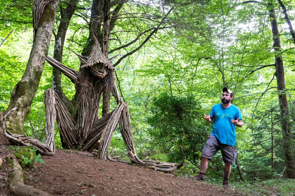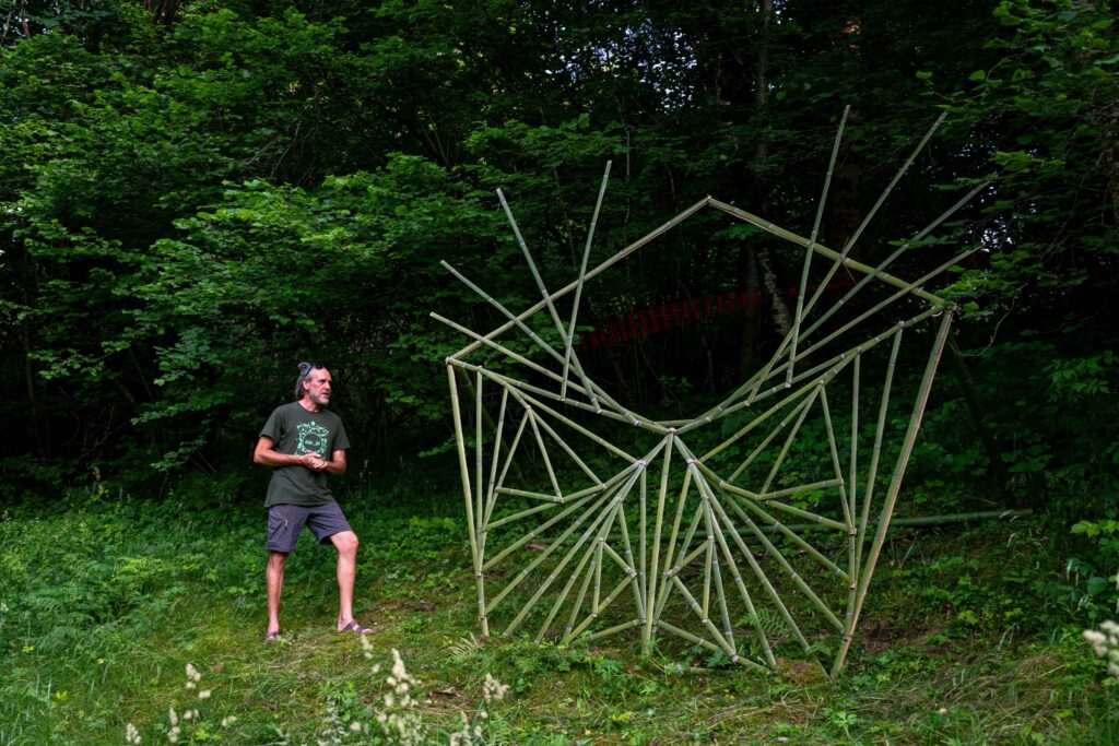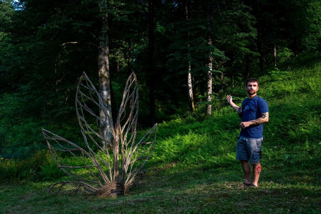 Durante la settimana sono state realizzate ben 8 opere da un team, appunto, di 11 artisti, che hanno lavorato sia individualmente che in piccoli gruppi. Alcune opere sono state interamente costruite in loco utilizzando esclusivamente materiali locali (legname e potature derivanti dalla gestione forestale dell’area). Altre hanno previsto l’integrazione con materiali naturali come bambù e salice, non presenti nell’area ma fortemente connotativi del linguaggio espressivo degli artisti coinvolti.